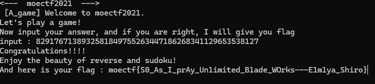 发现是异或解密后输出flag,因此我们无需计算,直接将数独所得结果输入程序,便可得到flag